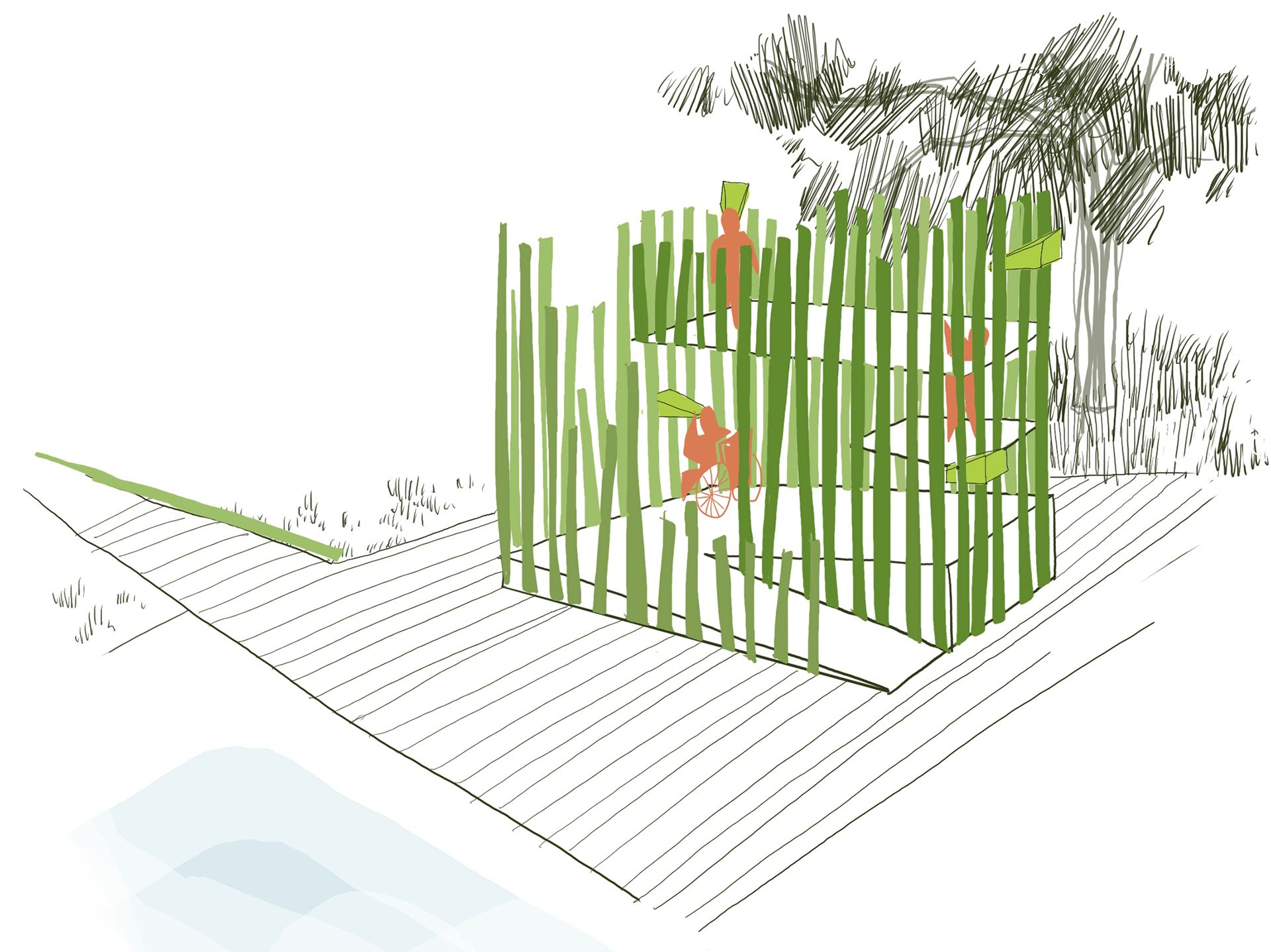 Une variante est alors affinée au stade d’avant-projet. Elle permet de garantir un accès presque généralisé aux personnes à mobilité réduite grâce à une passerelle s’implantant dans les espaces de pente. Cette dernière relie ainsi l’espace jeux «des grands» en contrebas et l’espace jeux «des petits» à proximité de la pataugeoire, sur les hauteurs. L’espace de jeux développe également plusieurs thématiques intégrant différentes formes de handicaps (travail sur les sens du touché, de l’ouïe, de la vue) à affiner avec des concepteurs jeux en phase de projet.
