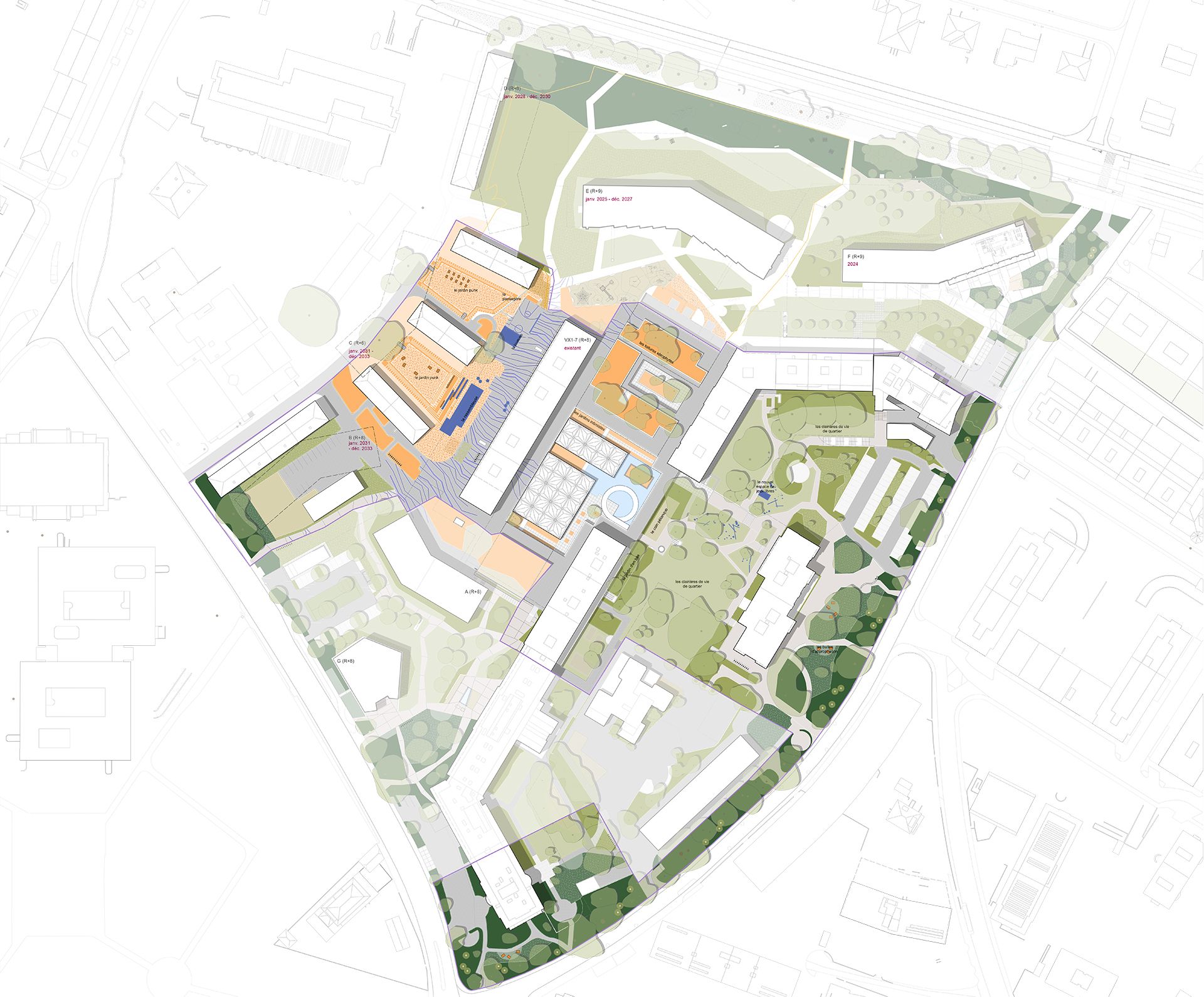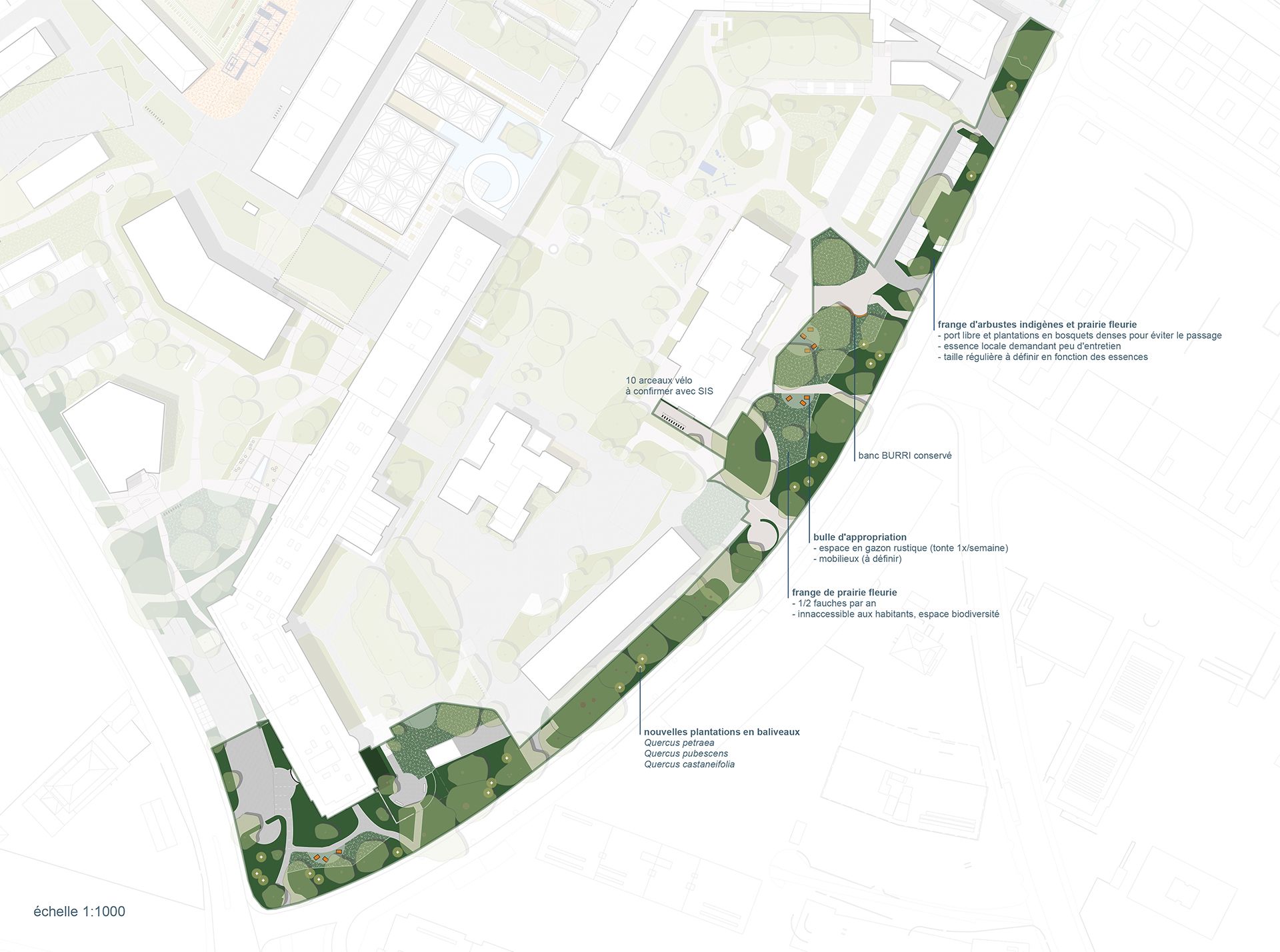 La première étape (long terme) propose de développer une image directrice à l’horizon 2035, prenant en compte les questions d’îlots de fraicheur, de mixité dans l’espace, de régénération des plantations, d’augmentation de la biodiversité et d’une gestion vertueuse des ressources en eaux. Cette image permettra, entre autres, d’accompagner les travaux et de guider les choix de matérialité des revêtements, d’essences végétales et de spatialités.
