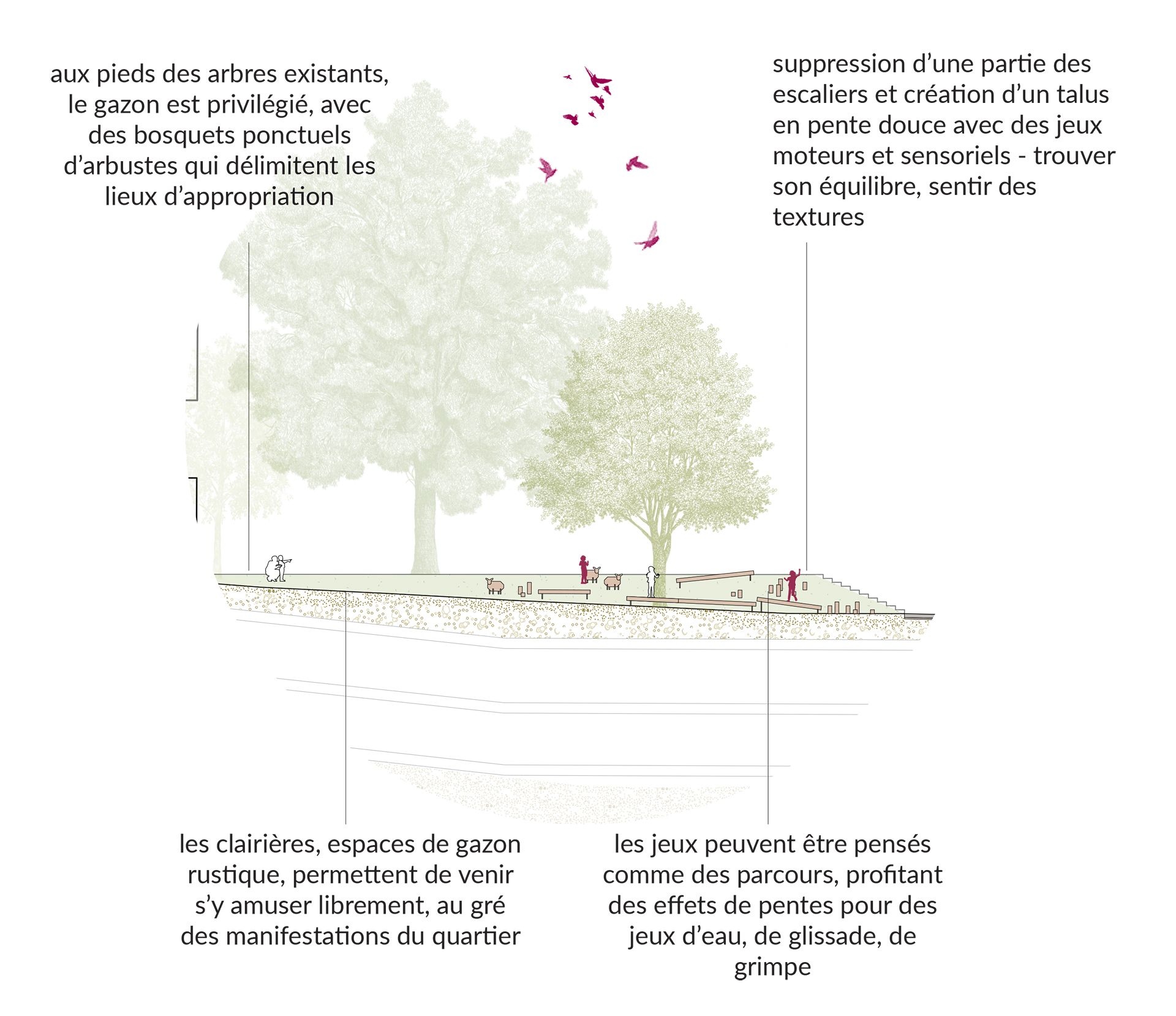 La deuxième étape (court terme) propose d’accompagner la transition du quartier et d’aménager des espaces ponctuels répondant rapidement au confort des habitant·e·s (espace de brumisation et d’ombre, nouvelles plantations), tout en pouvant évoluer avec les mutations à venir du quartier. Ces nouveaux lieux offrent des espaces d’appropriation multiples en apportant une dynamique ludique et en proposant des points de rencontre, à l’abri d’un coin d’ombre ou sous la fraicheur de plantes grimpantes.